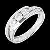 Una montatura sobria e classica sottolineata da un doppio giunco che si apre delicatamente su una trilogia di diamanti.