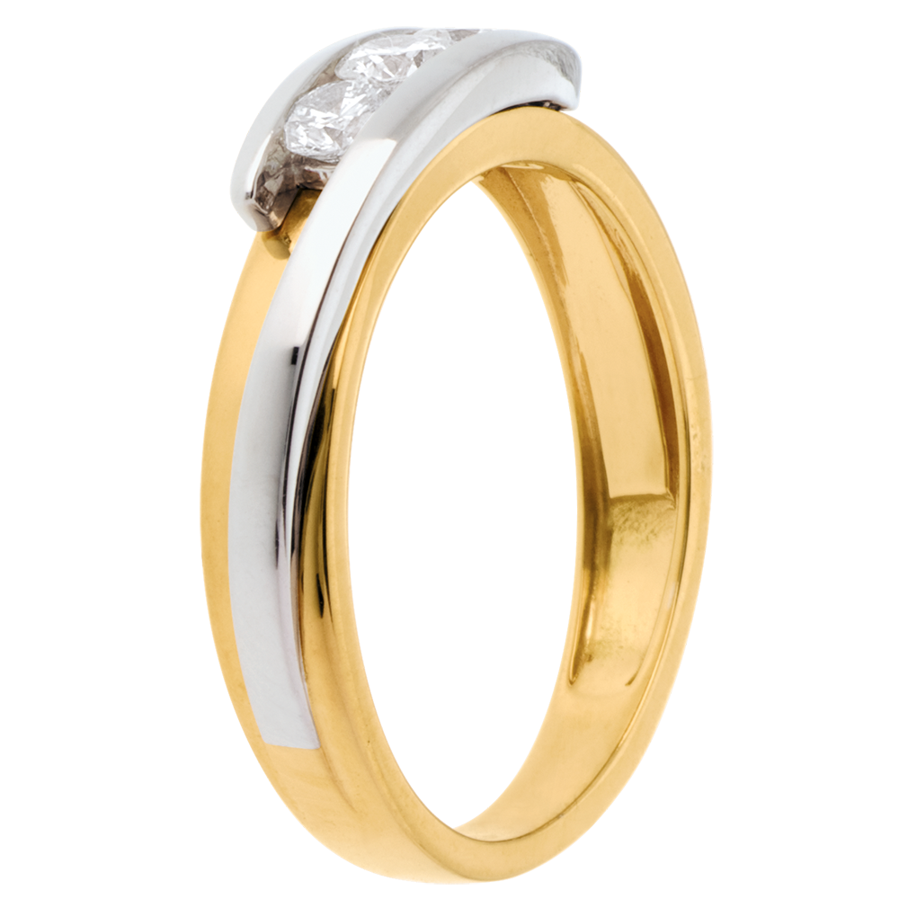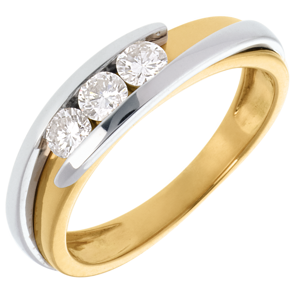 Una montatura sobria e classica esaltata dall'unione d'Oro giallo e bianco, per sottolineare con delicatezza una trilogia di diamanti